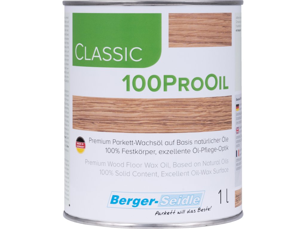 Classic 100ProOil je ekologická impregnace parket na olejové/voskové-bázi. Produkt vychází ze šlechtěného rostlinného oleje a voskování. Classic 100ProOil se nanáší špachtlí 2x až 3x - podle absorpce dřeva.