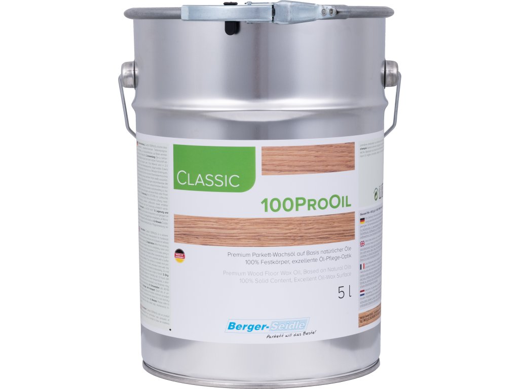 Classic 100ProOil je ekologická impregnace parket na olejové/voskové-bázi. Produkt vychází ze šlechtěného rostlinného oleje a voskování. Classic 100ProOil se nanáší špachtlí 2x až 3x - podle absorpce dřeva.