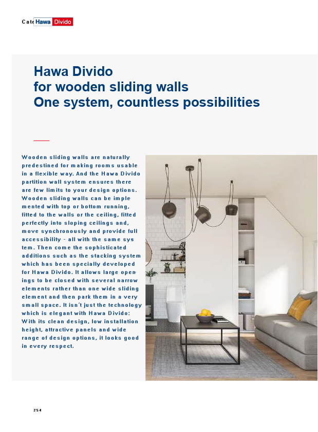 Systém posuvného kování EKU nyní HAWA Divido se vyznačuje jednoduchým designem. Varianta pro horní nebo dolní vedení pojezdu dveří v elegantních vysoce kvalitních hliníkových rámech s dřevěnou nebo skleněnou výplní, další použití je možné pro plné dřevěné dveře. HAWA Divido nabízí široký prostor pro vlastní nápady.